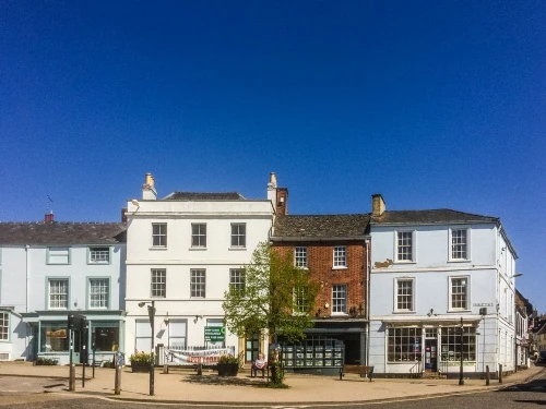 Several medieval buildings remain around the market square, though most of them are hidden behind later facades. One of these medieval buildings is the Crown Hotel, a 14th-century courtyard building behind a Georgian frontage.