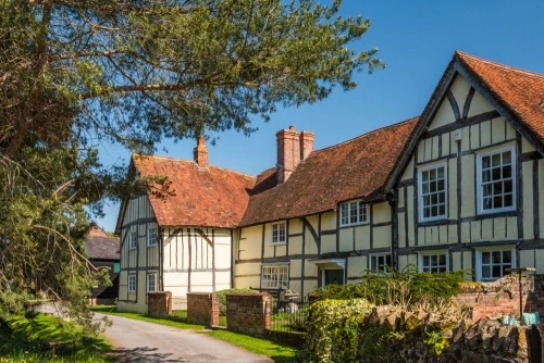 The hall (The Priory) dates to 1500, with a service wing added in 1550. A late 16th-century range abuts the hall to the east. The complex of buildings creates a courtyard plan with a wing to the east. The cottages stand two storeys high plus an attic, and are roofed with tile.