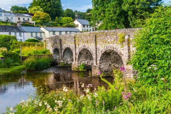 A picturesque six-arched stone 19th-century bridge crosses the river, with most of the village lying on the north bank. The bridge was built in the mid-Victorian period to replace a medieval packhorse bridge that spanned the river about 100 yards upstream. A picnic spot with a small car park stands beside the bridge.