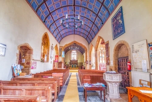 One interior highlight is an 1899 stained glass window in the south chapel, designed by the Pre-Raphaelite artist Edward Burne-Jones in honour of James Kelway, one of a family of famous nurserymen known for cultivating high-quality varieties of peony. The window was made by the William Morris studio and depicts the Nativity.