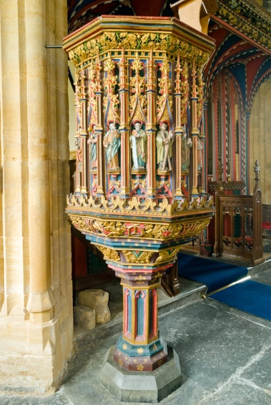 Beside the pulpit is a richly carved late 15th-century painted screen, stretching the entire width of the church. The upper section features elaborate fan vaulting and would originally have carried the rood loft. The tie-beam roof in the nave is also 15th century, and features beautifully carved and painted figures of angels holding heraldic shields.