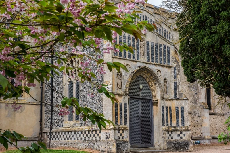 The medieval church owes its present form to its major patrons, Sir William de Bardewell (d. 1434) and his wife, whose arms appear in the spandrels of the arch over the doorway of the south porch. During the medieval period, the church was home to a Guild dedicated to St Peter, to which most of the village population seems to have belonged. The medieval Guild Hall is now a private house called, not surprisingly, The Old Guildhall, on Quaker Lane, near the church.