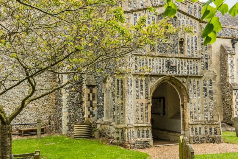 The oldest part of the present building dates to the 14th century though the 'long-and-short stonework of the walls suggests an earlier building. The large south porch boasts exceptional flint flushwork, and the porch roof vaulting has curious wooden bosses.