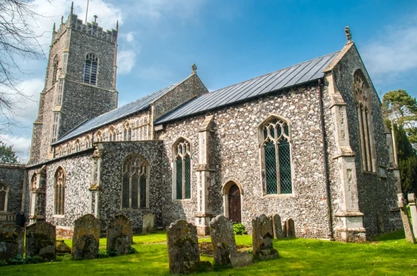 The church was rebuilt in traditional East Anglian knapped flint in the 13th century, when the south aisle, south porch, and clerestory were added. The highlight of the church is the beautiful 15th-century west tower, rising in three stages to battlements decorated with pinnacles at each corner.