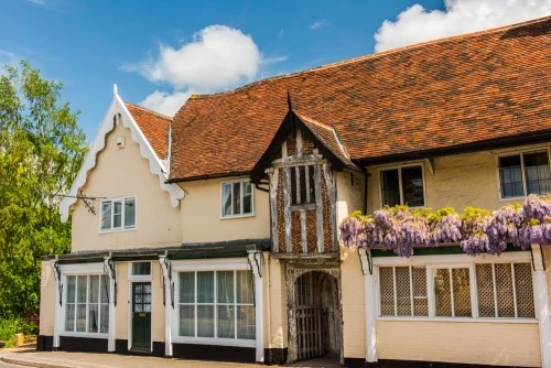 Further along High Street you come to the Angel Inn, a public house in a timber-framed 16th-century building, and beside it is perhaps the most striking historical house in Debenham, a 15th-century Wealden house with the addition of a Tudor rear wing and a second 16th-century cross wing.