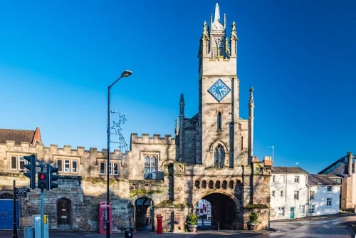 East Gate is a Warwick landmark; a 14th-century gateway topped by a 15th-century chapel standing at the junction of four major roads. It was built to allow access through the medieval town walls of Warwick. The gate consists of a twin-arched gateway topped by a chapel dedicated to St Peter, and adjoins a section of surviving medieval wall.