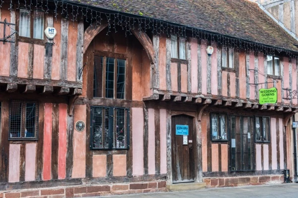 At number 20-21 is a timber-framed building, now a cafe bar, that used to be the Green Dragon Inn on Much Park Street. The front range dates to around 1500, while the rear block was built around 1450.