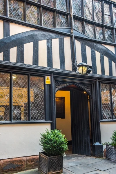 Opposite the ruins of Coventry's medieval cathedral stands another medieval treasure, St Mary's Guildhall, one of the best surviving medieval guildhalls in Britain. The exterior of the Guildhall, facing onto Bayley Lane, is deceptive; you see a large set of traceried windows above two rows of arched windows. Set in the centre of the ground floor is a low, arched opening leading to a hidden courtyard. Save for a piece of modern sculpture in the courtyard the view has remained unaltered for over 5 centuries.