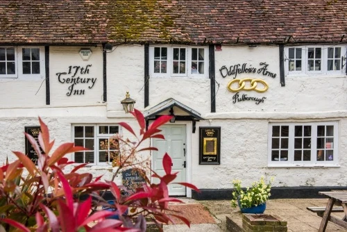 There are seven timber-framed medieval buildings in Pulborough, among them 15th-century Wealden house at 73-9 Lower Street, and the former Five Bells on London Road, mentioned earlier. Also on Lower Street is the Oddfellows arms, built around 1460, and on Church Hill, visible from the churchyard lych gate, is The Old House, a mix of brick and timber-framing probably dating to the 15th century. Slightly younger but still very striking is Swan Cottage, by the roundabout at the bottom of Church Hill, which probably dates to the 16th century.