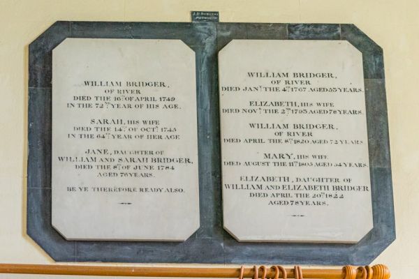 The oldest memorial we could find was to two generations of the Bridger family of River, a nearby estate. The earliest people mentioned was Sarah Bridger (d. 1745) and her husband William Bridger (d. 1749).