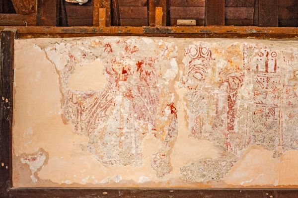 On the north wall are traces of medieval wall painting, thought to date to the first half of the 12th century . The scene has been truncated, the top edge lost when the roof level was lowered. The paintings show a pair of draped figures and a building that may represent a tower. The meaning is unclear; it has been variously interpreted as the Last Supper or, alternatively, St Christopher and the Christ Child.
