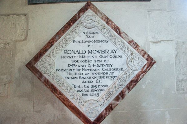 On the wall is a marble tablet in diamond shape commemorating Ronald Mowbray, a private in the Machine Gun Corps who died of wounds received in action on 12 June 1917.