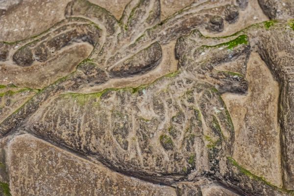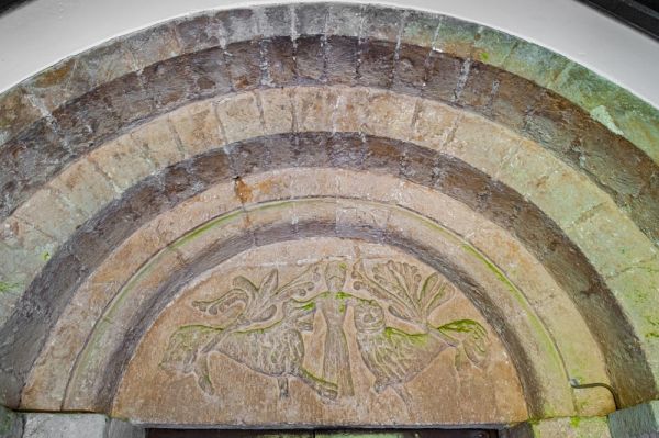 Ah, the doorway. It is why most people come to Shalfleet Church, for it boasts an exceptional 12th-century carved tympanum over the door. Exceptional, yes, but no one knows quite what to make of it! The carving appears to show a bearded man with his hands on the heads of two lions, but how to interpret the symbolism is a matter of constant debate.