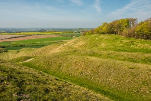 The northern edge of the hillfort ends at the steep scarp of the Cherhill Down. Partway down the slope of the hill is the Cherhill White Horse, a chalk outline of a horse built in 1780 by Dr Christopher Allsop of Calne.