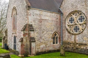 You enter through the tower, via a 13th-century archway. The chancel arch dates to around 1315, but the chancel itself has been heavily rebuilt, most profoundly in 1860. The east window has fragments of medieval glass, gathered from around the church. At the base of the central panel are bits of glass from Chartres Cathedral in France. The lower left roundel was discovered under the floor of the Giffard Chapel.