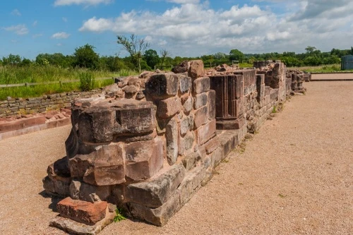 The timber buildings were very quickly rebuilt in stone. The earliest buildings were made of plainly carved green sandstone, but later buildings were constructed using finely carved red sandstone.