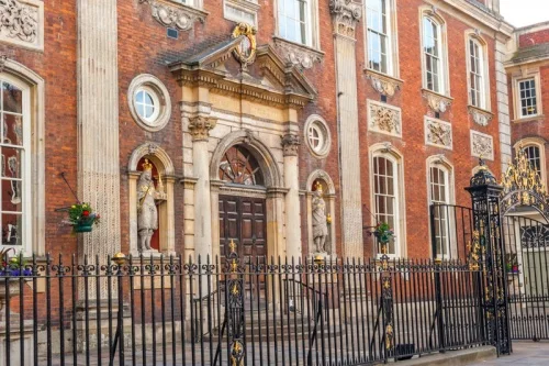 The most striking external feature of the Guildhall is a set of iron gates and railings facing onto High Street. These were erected in 1750, and are eye-catching due to the gilded design of the entrance gateway.