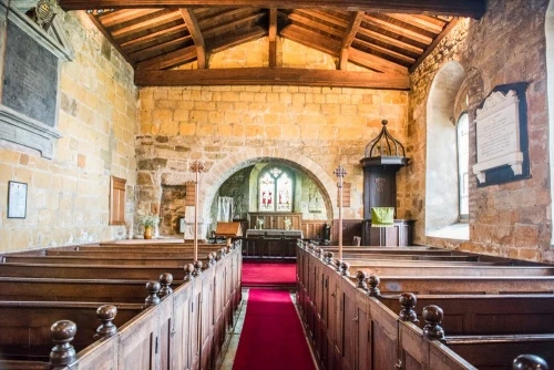 The church is built mostly of golden-toned stone quarried locally. The core of the church is a two-celled Norman building consisting of a nave and chancel.