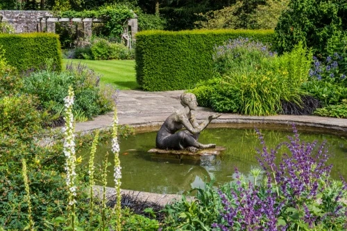 From the woods, you climb up through an orchard with red-themed borders to formal terraces below the Hall. At the centre of the highest terrace is a lovely pool with a statue, acting as a centrepiece. There is a camellia walk beside the formal terraces.