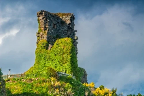 Standing above a rocky foreshore looking towards the Sound of Pladda, on the southeastern tip of Arran, is Kildonan Castle, a 13th-century fortress built by the MacDonald Lords of the Isles to guard the approaches to the Firth of Clyde. It was allowed to fall into ruin in the 16th century.