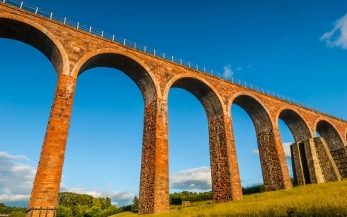 The striking Victorian viaduct is a sight to behold, with 19 high, slender arches supporting the railway bed. The semi-circular arches are made of brick for extra stability while the rest of the structure is built of large blocks of dressed pinkish-red sandstone, giving it a beautiful reddish hue.