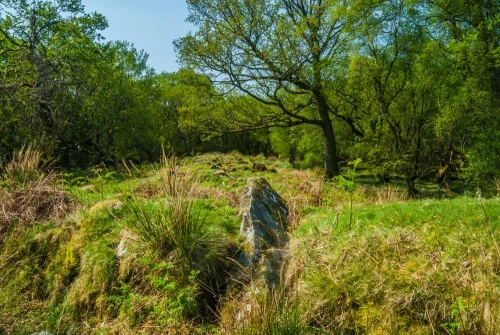 At the northern end of this parking area the paved path now just a single vehicle's width, continues along the coast towards South Wood of Lenihuline. It is just under 1km top the woodland, where an obvious path leads off to the right into the woods. Just follow this path for approximately 700m and you will arrive at the chambered cairn.