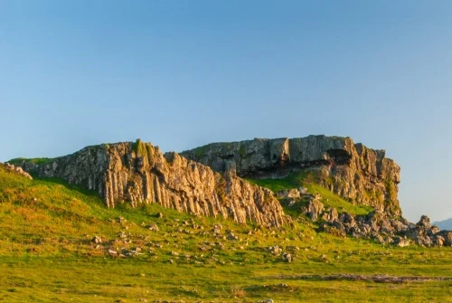 There are vertical cliffs on the northeast and northwest of the basalt ridge, with the fort at 35m above sea level. These cliffs mean that Dunagoil is sometimes described as a 'cliff fort'. To the southeast, the ground slopes away gradually to a cove. To the north and east, the approach is defended by a drystone wall that still stands up to 1m (3 feet) high, creating an outer enclosure, or bailey.