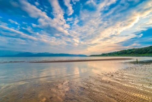 There is a small, rocky foreshore leading down to a broad beach of reddish sand, up to 1km (0.6 miles) long at low tide.