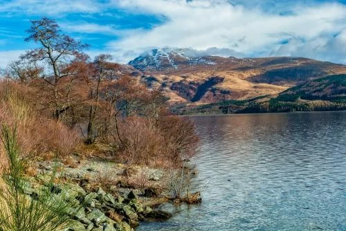 Made famous in the old song "The Bonnie Banks o' Loch Lomond", Scotland's largest loch in terms of area stretches 24 miles long and lies on the Highland boundary fault dividing Lowland and Highland Scotland. The area north of the loch is mountainous and to the south is wooded islands and shores. One popular way to see the loch is a boat cruise leaving from the Balloch pier.