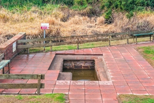 The well rises up through a 20th-century L-shaped tank, creating a bathing pool. The tank is made of reddish sandstone ashlar, with a set of stone steps leading down into the water. The water originally drained into the tank through a pipe with an iron cup attached by a chain so that visitors could take a drink of the mineral-laden water.