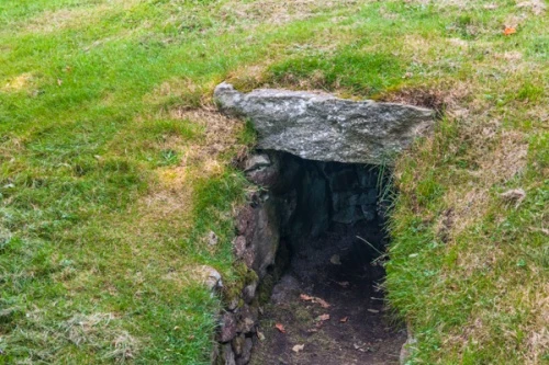 The earth house entrance is simply a level passage into a sloping hillside. The opening is not protected in any way, but it is perfectly dry and secure once you get past the entrance.