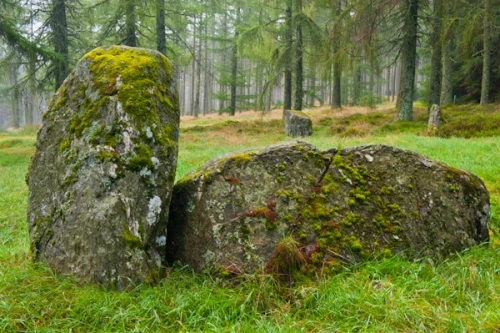 Also known as the Mulloch Stone Circle, Nine Stanes stands in a wooded setting within a forestry plantation in Mulloch Wood, two miles west of Blairydryne Bridge on the A957 road between Banchory and Stonehaven.