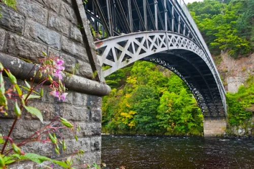 The lovely 19th century cast iron Craigellachie Bridge spans the River Spey. It was designed by famed Scottish engineer Thomas Telford, who was responsible for so many other 'firsts' in Britain. Telford's bridge is the oldest surviving cast iron bridge in Scotland and was widely regarded as an engineering triumph when it was built in 1814.