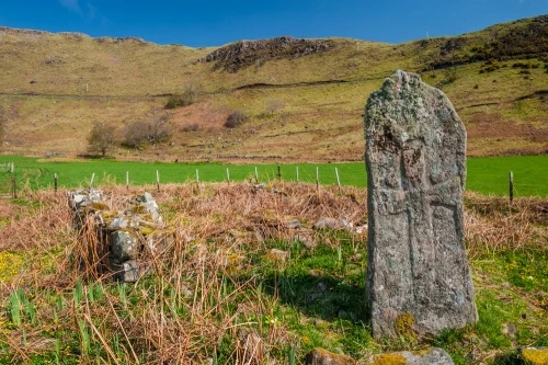 The south coast of the Ardnamurchan peninsula is dotted with ancient sites. One of the most intriguing is at Camas nan Geall (Bay of Strangers), near Glenborrodale, where a Neolithic or Bronze Age standing stone stands immediately beside a post-medieval burial ground with several finely carved gravestones.
