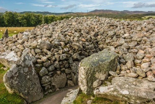 Corrimony Chambered Cairn is a superbly preserved Bronze Age passage grave in an idyllic rural location in Glen Urquhart. The burial mound is surrounded by a circle of 11 standing stones of varying height.