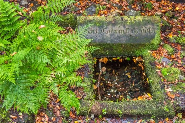The well consists of a square basin lined by stones. Above it is an inscribed stone with the words 'St Columba's Well'. There is no obvious way down to the well from the viewing platform so you can't easily test the healing qualities of the water for yourself.