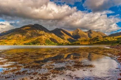 These 5 peaks include 3 Munros (mountains over 3000 feet high). The Sisters dominate the entrance to Glen Shiel and present an almost impossibly picturesque view as you approach the tip of Loch Duich. There are two good places to view the Five Sisters; one is at Ratagan, on the far side of the loch. Simply take the route signposted to the Glenelg Ferry at Shiel Bridge and turn off on the minor road to Ratagan after a mile. There are several laybys beside the loch where you can get a good view of the mountains.
