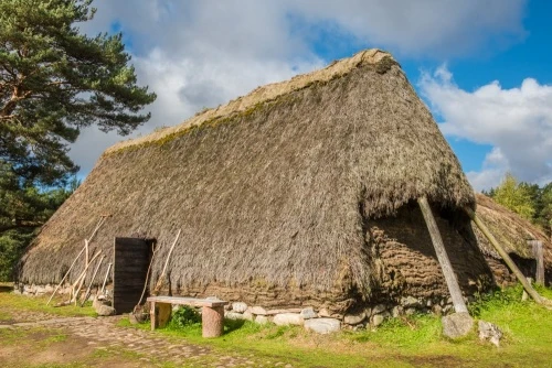The township spans the period from the later Middle Ages through the 18h century and is presented as it would have looked in the year 1700. These crofting buildings were made with timber cruck-frames, and earth walls atop a stone foundation, with a thatched roof. Peat fires burn inside some of the houses, and livestock wander among the buildings.