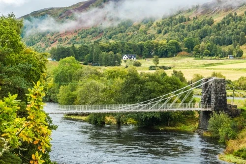 The Bridge of Oich is an innovative suspension bridge across the River Oich built in 1854 by James Dredge. Dredge's design broke new ground in bridge architecture, incorporating a unique double cantilever chain support system balanced upon huge granite pylons on either shore.