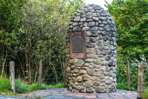 The memorial is in the shape of a traditional Highland cairn standing well above head height. This style of cairn was often used for memorials. You can see similar cairns at Culloden Battlefield near Inverness and at the Prince's Cairn on the Road to the Isles.