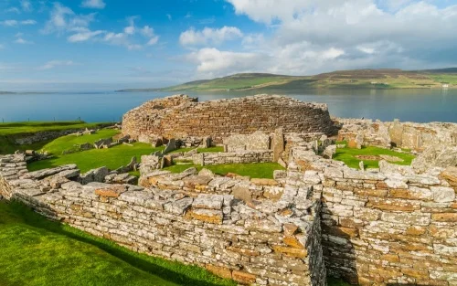 Gurness is a well-preserved Iron Age broch with a surrounding settlement, with evidence of later use during the Norse period.