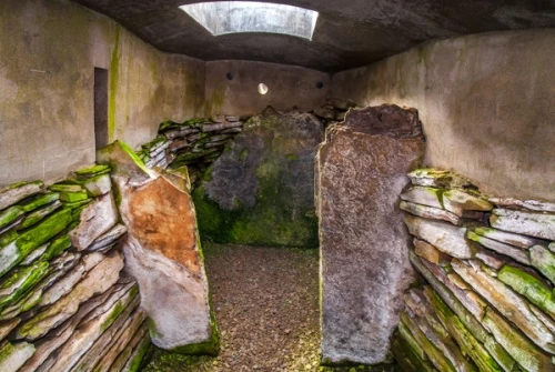 Given the size of the cairn and the number of stalls, it seems odd that only two skeletons were discovered. One reasonable theory is that the cairns acted as a cemetery for local communities over the course of centuries, and the communities probably cleared out older remains when new burials were made.