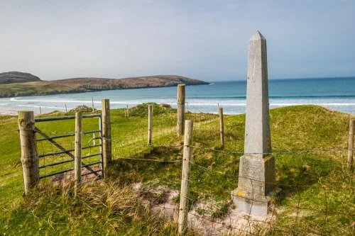 A simple concrete obelisk marks one of the most tragic events in the history of Vatersay, and one of the worst disasters in maritime history anywhere in the world. The monument stands at the edge of the machair, looking west over Bagh Siar, where in 1843 fully 348 men, women, and children died when the brig Annie Jane ran aground in a storm.