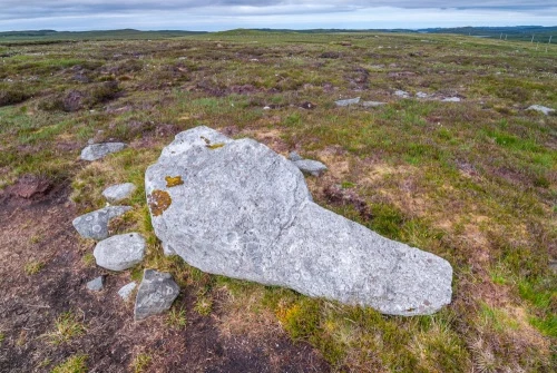 Intrigued, the two amateurs went to Achmore to have a look. They found one upright stone and several more prone slabs that had been exposed by peat cutting. In all, eight prone stones were found, each with small packing stones at their bases. The eight prone stones lay on an arc, which, if extended, took in a larger circle that cut through a raised area where the peat had not yet been cut back.