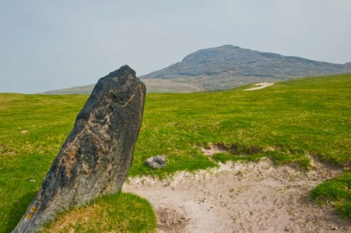 The Borve Standing Stone is a solitary standing stone looking rather lost in the midst of thick machair about 50 yards from the coastal road opposite the signposted road to Borve village. Haphazard excavations here have turned up evidence of human remains, possibly a Viking burial.