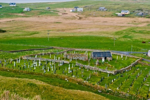 A fascinating site with a rich history, Cille Bharra stands near the northern end of the Eoligarry peninsula, north of Barra airport and its unique beach runway. Within the stone walls enclosing the site stand three chapels, two now ruinous, dedicated to St Barr, the 7th-century Irish monk who gave his name to the island of Barra.