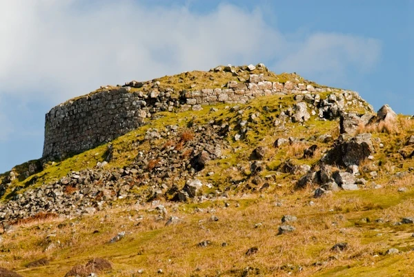 We don't know for certain, but this style of broch became common from around 500 BC. It was occupied - though not continuously - into the medieval period. Coins from the medieval period and as late as the 19th century have been found on the site. The earliest coins come from the reign of Henry II of England (1154-1189). Outside the broch walls are heaps of stones showing where later buildings were erected.