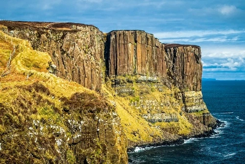 Kilt Rock is responsible for the name of Staffin, to the north. Staffin comes from the Old Norse term 'stafr', meaning pillars, a reference to the basalt columns that make up the cliffs.