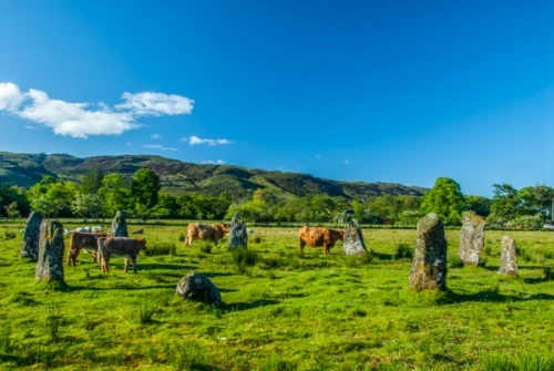 This small stone circle is the only one on Mull and stands in the grounds of Lochbuie House, in a breathtakingly beautiful setting, under the watchful gaze of Ben Buie. The circle probably dates to the late Neolithic or early Bronze Age.