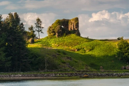 Aros Castle, also known as Dounarwyse Castle, is a ruined 13th-century stronghold on the rocky estuary of the Aros River, looking across the Sound of Mull to the Scottish mainland.